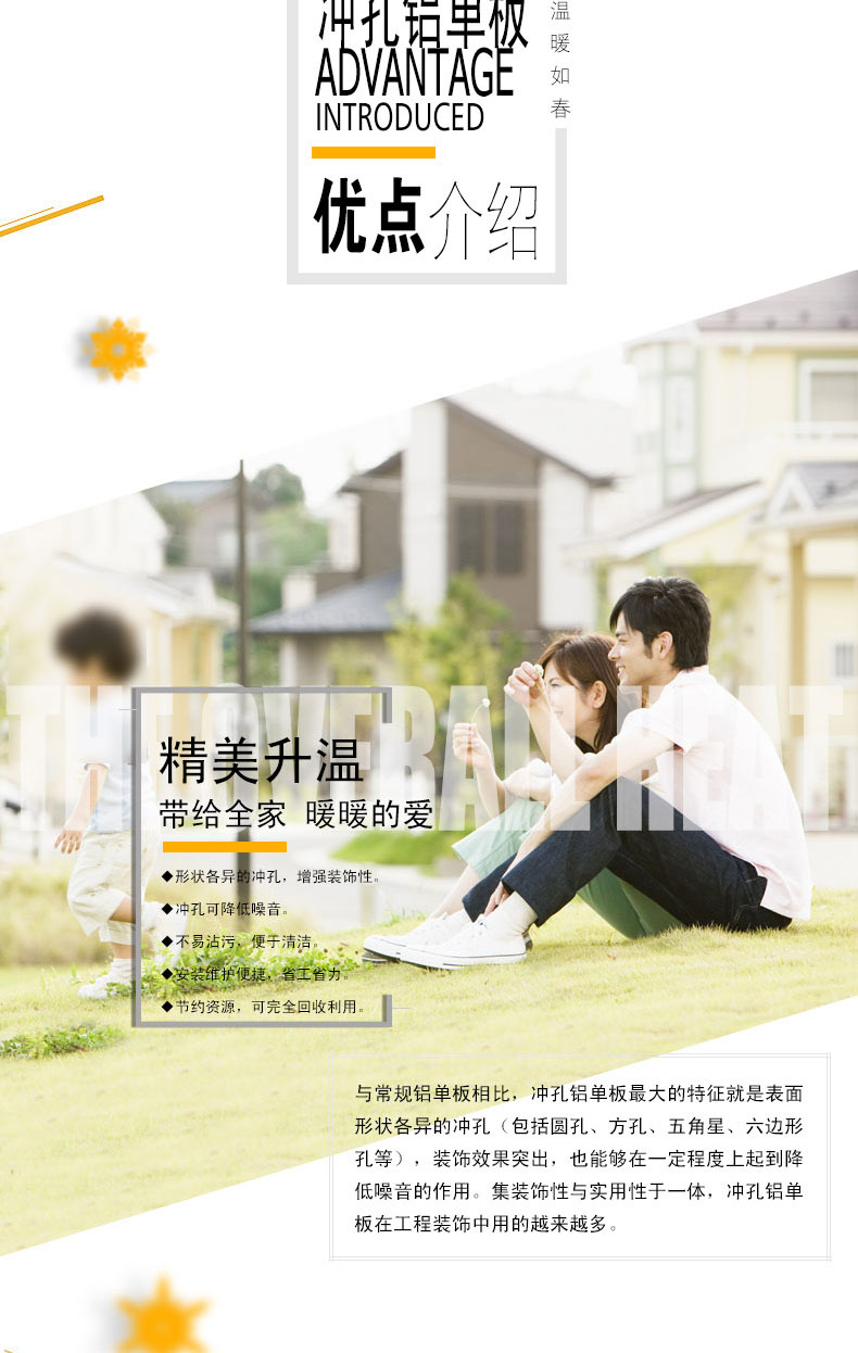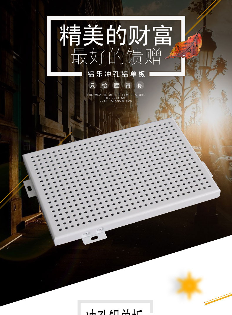與常規(guī)鋁單板相比,沖孔鋁單板的特征就是表面形狀各異的沖孔(包括圓孔、方孔、五角星、六邊形孔等),裝飾效果突出,也能夠在一定程度上起到降低噪音的作用。集裝飾性與實用性于一體,沖孔鋁單板在工程裝飾中使用的越來越多。氟碳沖孔鋁單板特點: